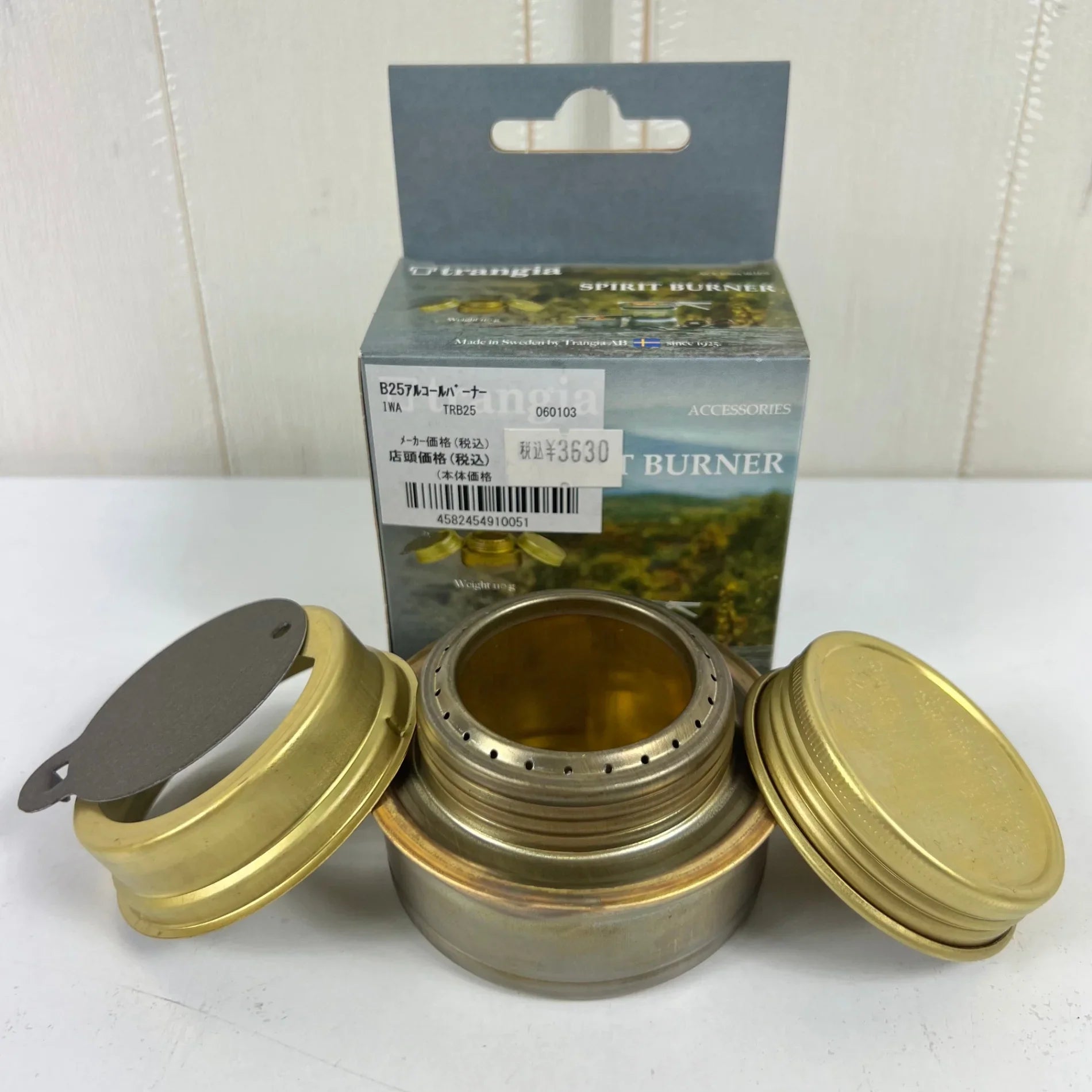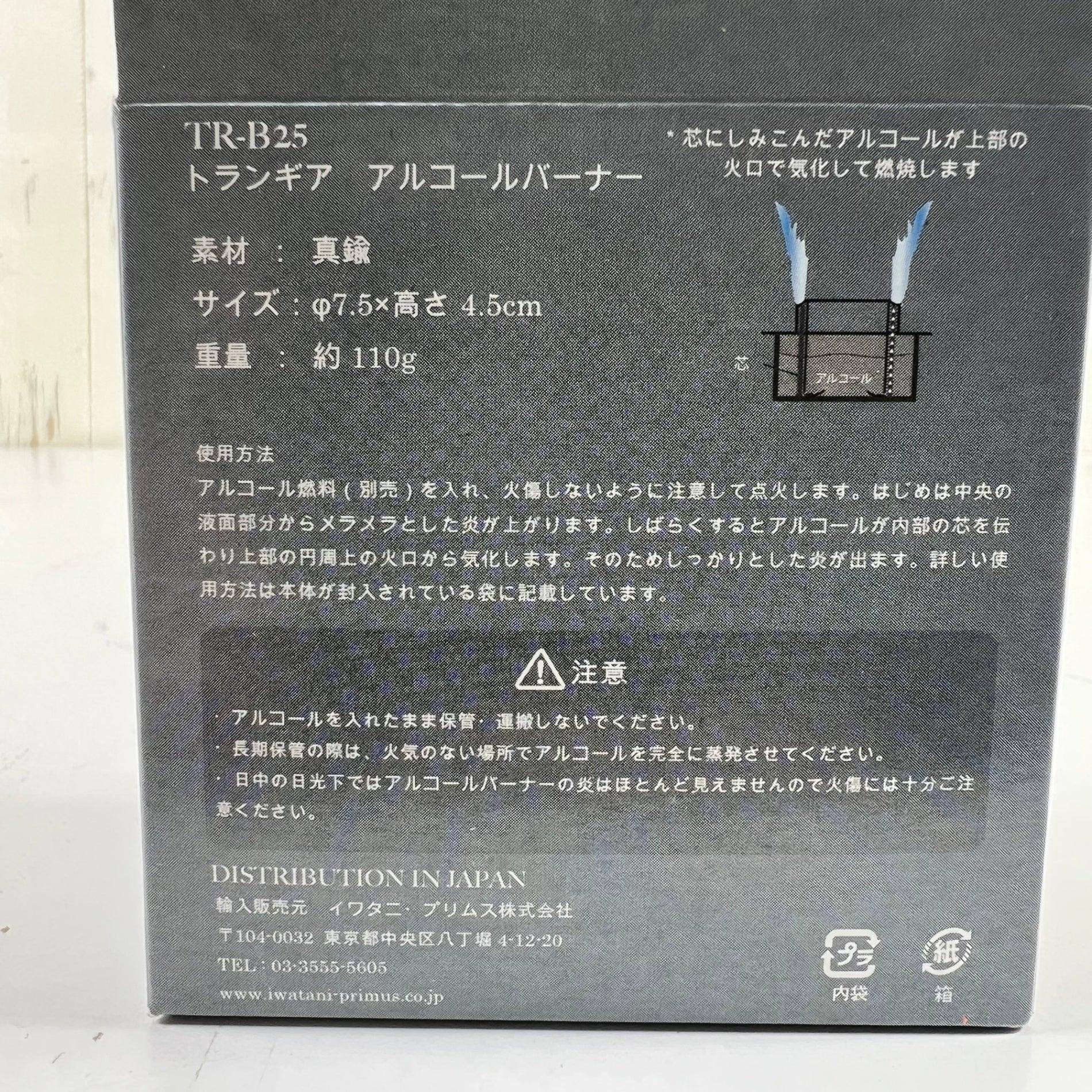 This Swedish-made alcohol burner has been a best-seller for over half a century. Crafted from brass, it develops a patina with age. It burns for approximately 25 minutes with a 2/3 tank (approximately 70ml). It's resistant to wind and low temperatures and easy to light. It burns quietly and uses ethyl alcohol or methyl alcohol, which can be purchased at drugstores. It weighs 110g, has a storage size of 7.5cm diameter x 4.5cm height, and has a maximum capacity of 100ml. A genuine trivet (for the TR-B25) is required for use. z00056878