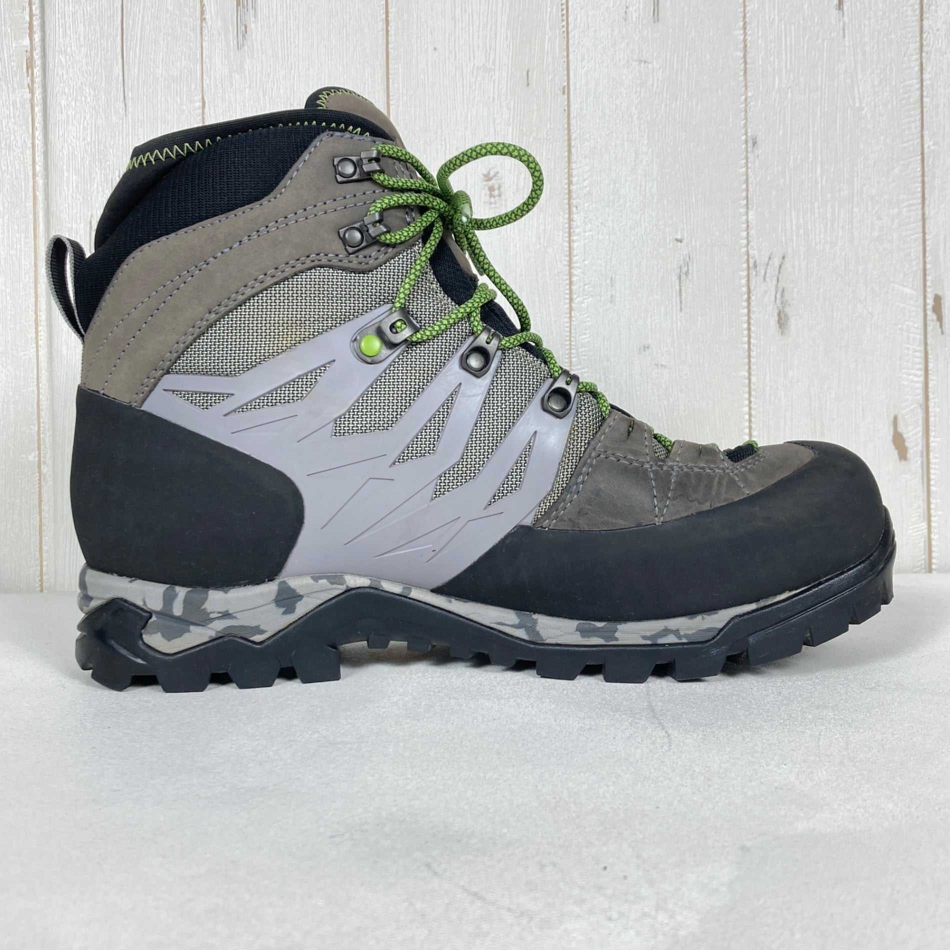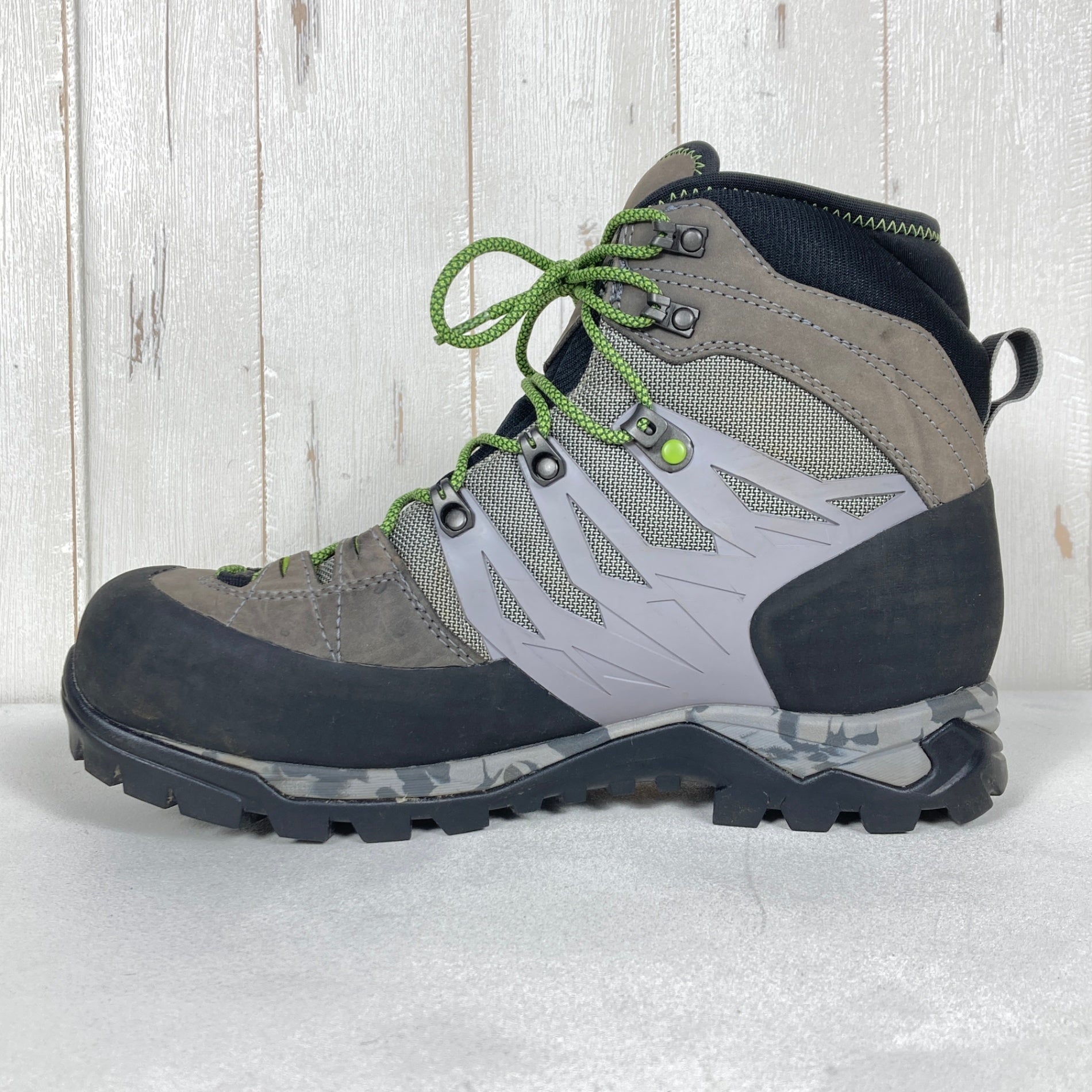 軽量で日本人の足型に合わせたフィット感を重視したライト トレッキングブーツ。広めの3E+ラスト(足幅)、しっかり足全体を包み込むTPUリブゲージ設計、足首まわりにクッション性を強化。アッパー材は撥水加工済みナブックレザー(1.6-1.8mm厚)と撥水ナイロンを組み合わせ、つま先・踵にはラバープロテクション、GORE-TEXライナー内蔵で高い防水・透湿性能を備えています。アウトソールはVibram MEGAGRIP採用で泥はけが良く、不整地や岩場で高いグリップ力と安定性を発揮——日本の山岳地形に最適なパターン設計。ソール張替え対応。重さは約600g(26.0cm片足)。春・夏・秋の山行に対応