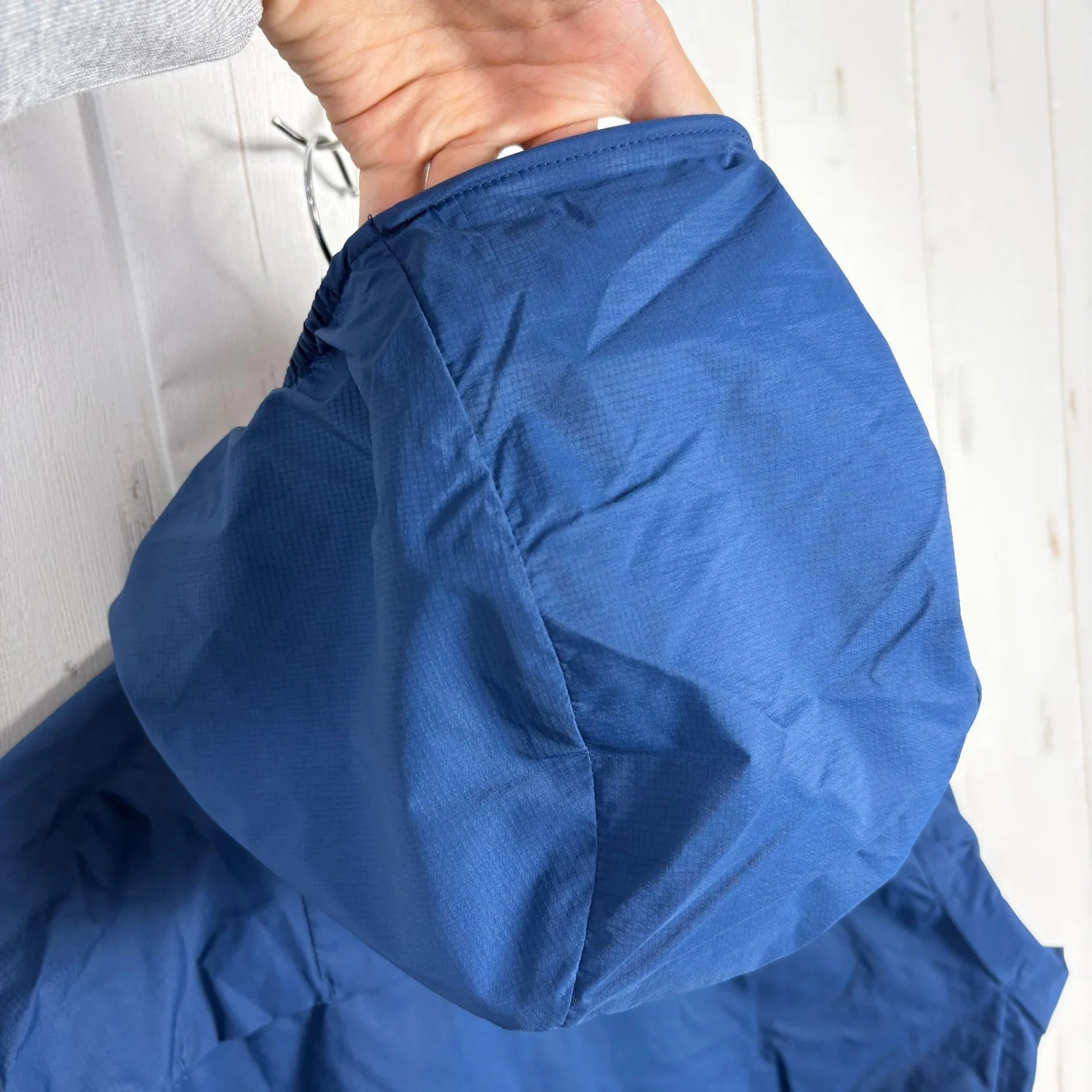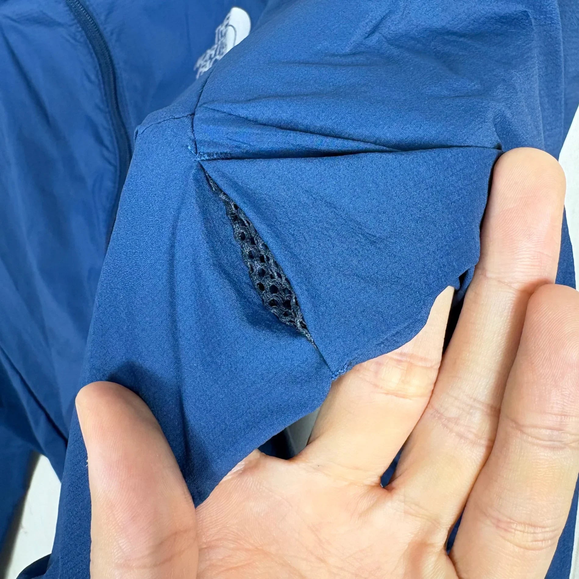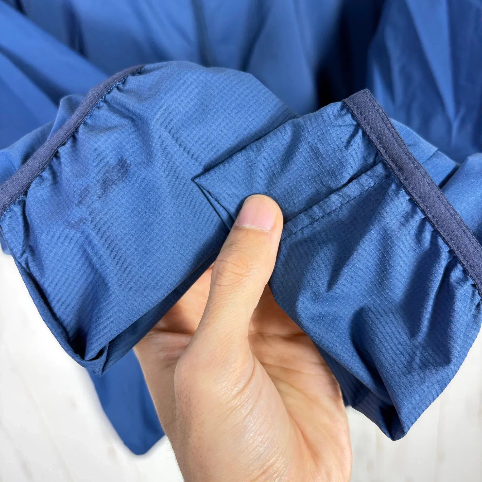 This lightweight windproof jacket offers enhanced functionality, including lightness, ease of wear, and portability. The recycled nylon fabric has been treated with a durable water-repellent finish and is a double-weave structure with slight unevenness on the skin side and point contact. It doesn't feel sticky even when you're sweaty, increasing comfort. The ventilation system, which expels moisture from inside the garment, has a simple structure that utilizes fabric switching and is located on the back and under the arms. In addition, zippered pockets on the left and right sides serve as ventilation, improving the breathability control of the entire garment. It is pocketable and can be stored inside the hood for compact portability.