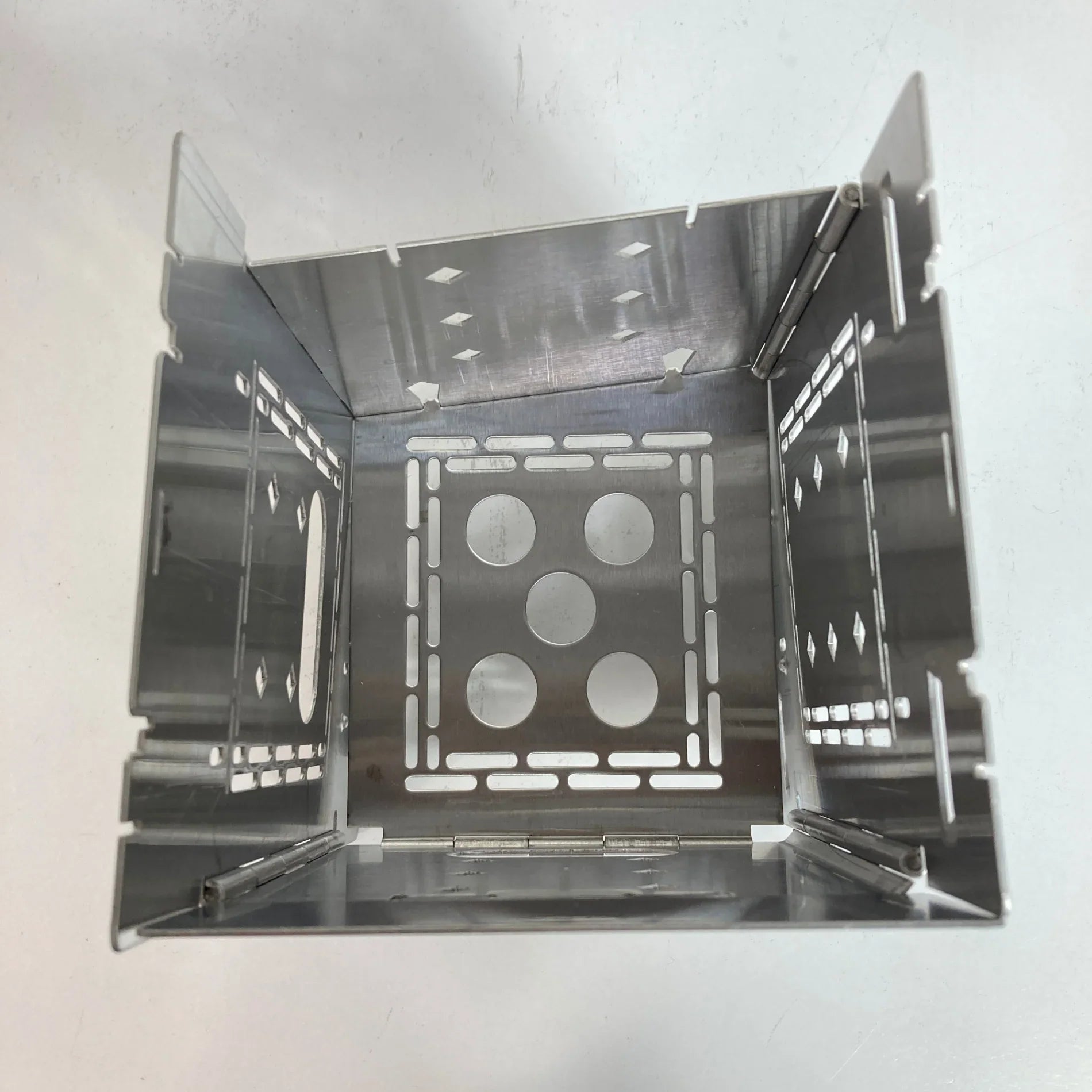 Fuel found in nature, wood, solid fuel, alcohol burner, This is a cook stove that can be used with alcohol. It is larger and more robust than the Firebox Nano. It is stable so you can place a large Dutch oven on it. It also works well with small cooking utensils the size of a cup. It's easy to set up and open, It folds flat and can easily fit into a backpack. The second generation G2 firebox stove has many improvements. There are two openings at the bottom of the sides for cross-loading firewood. The newly designed bottom plate It is less likely to warp and has better ventilation holes. New position for your firestick. 【Features】 - No complicated assembly required thanks to the hinges - A wide variety of fuels can be used, including wood, solid fuel, and charcoal ・Small but retains high heat ・Shape suitable for a variety of cooking ・Compatible with any cooking utensil -Can also be used as a portable campfire
