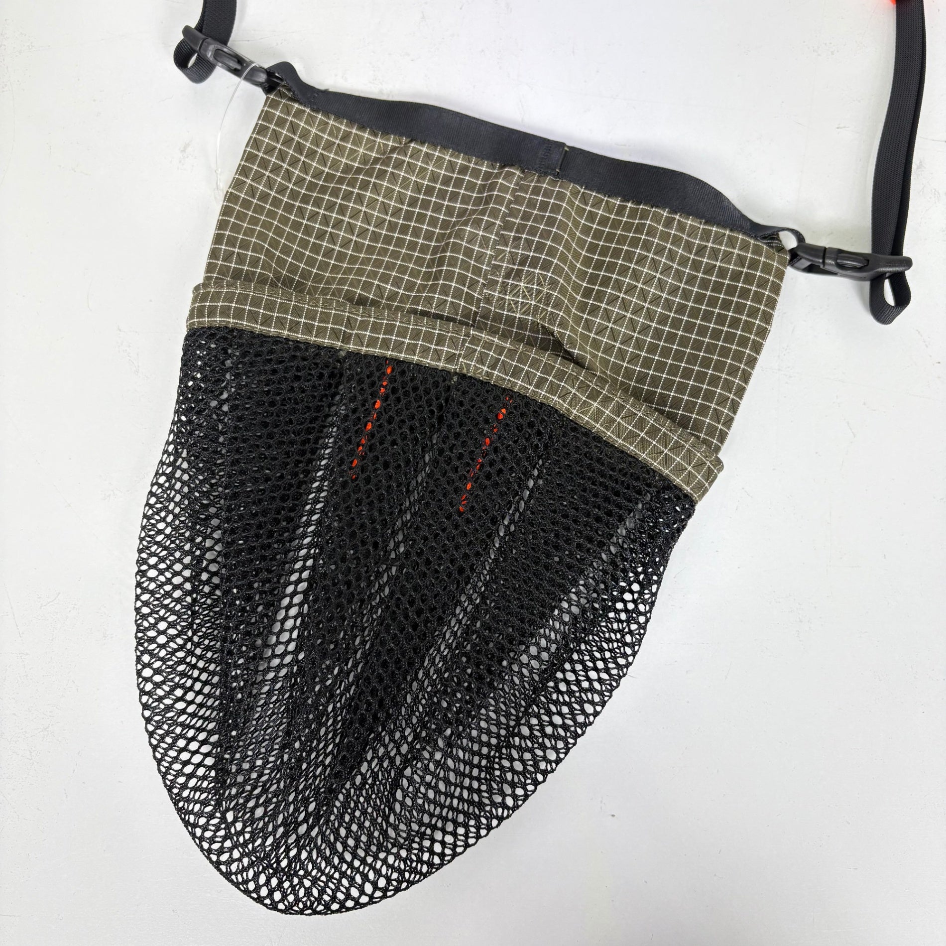 3年間の集大成とも言うべきバッグ。本体はSpectra生地と210デニールのセミダルナイロンラッセルメッシュのコンビで製作。上部はオリジナルスタイルのコードパイピングでソフトボーン仕様の為柔らかく型崩れしないタフ&軽量に仕上げている。下部は軽く上質で丈夫な210デニールのセミダルナイロンを使用したラッセルメッシュ仕様で、床に置いたバッグが型崩れして倒れる心配がない。最大のポイントは底面と側面がシームレス構造な事で、縫い目のないゴム風船みたく内容物によって自在にマチが変化しプリーツ構造でより柔軟性に優れた袋に組み上げた。スマホやタオルはもちろん500mlペットボトルも収めることができる。内部にはコア入り2.4mmコードを一部チューブ仕様にしている為、コード自体がへたらずフック等をかけやすい。ストラップを外せばメッシュ仕様の型崩れしにくいスタッフサックとしても使用可能な2way仕様。重量61g(±2g)。 z00057431