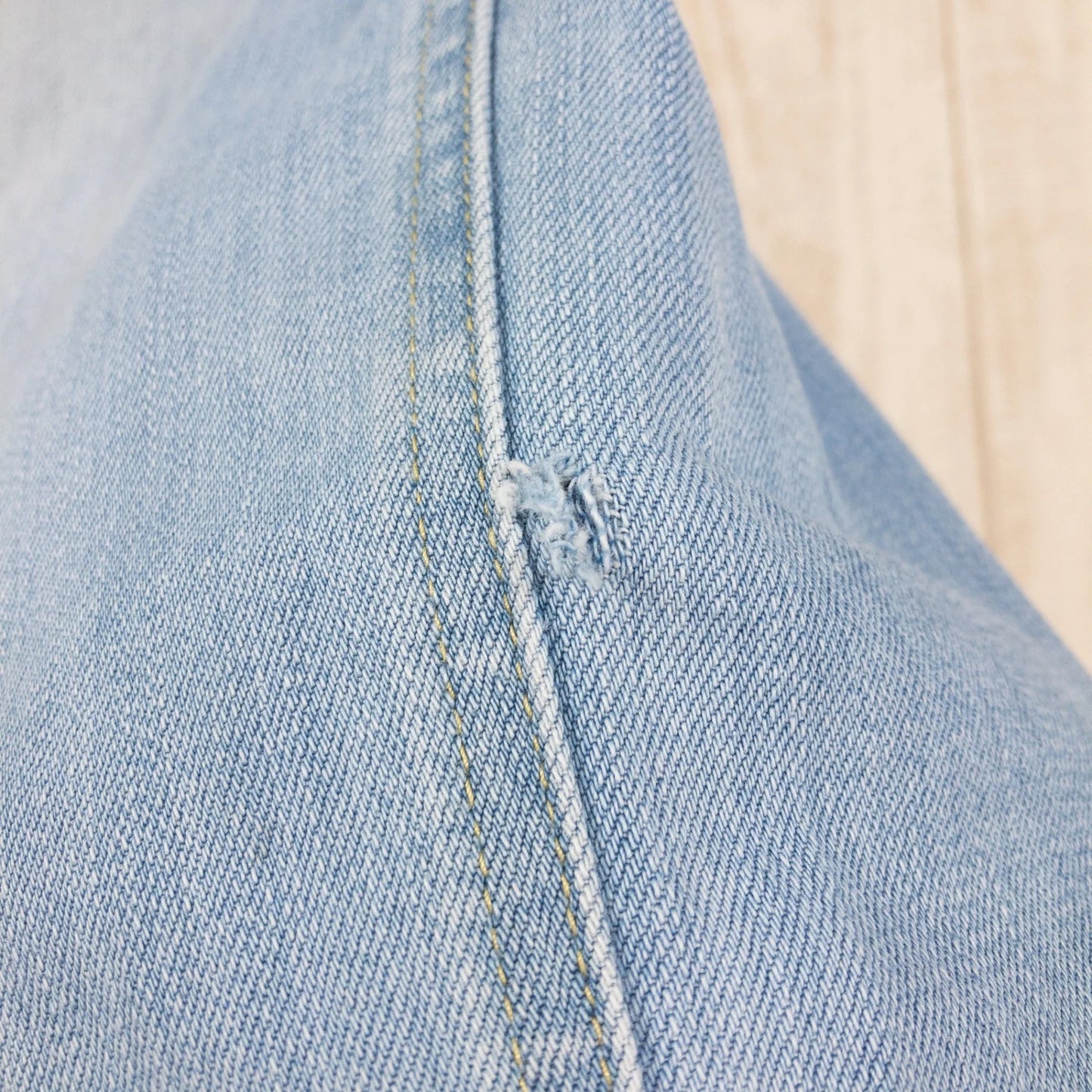 ■状態スコア:35 / 100 点 ■状態明細:多少の使用感 / 多少の汚れ(各所) / 多少の色落ち(正面を中心に各所) / 若干の毛羽立ち(ヒザ部分) / 若干の穴(左ひざの左側)