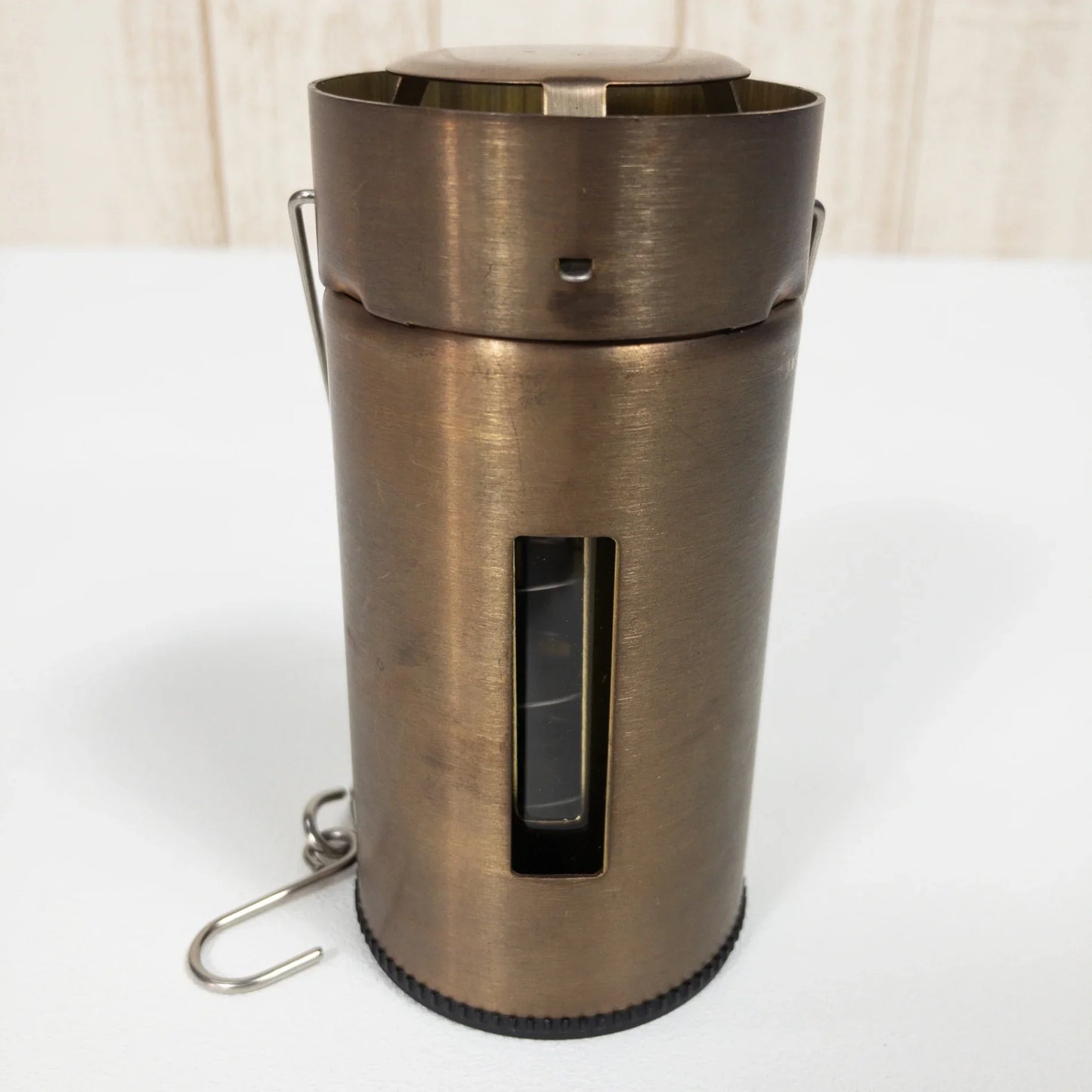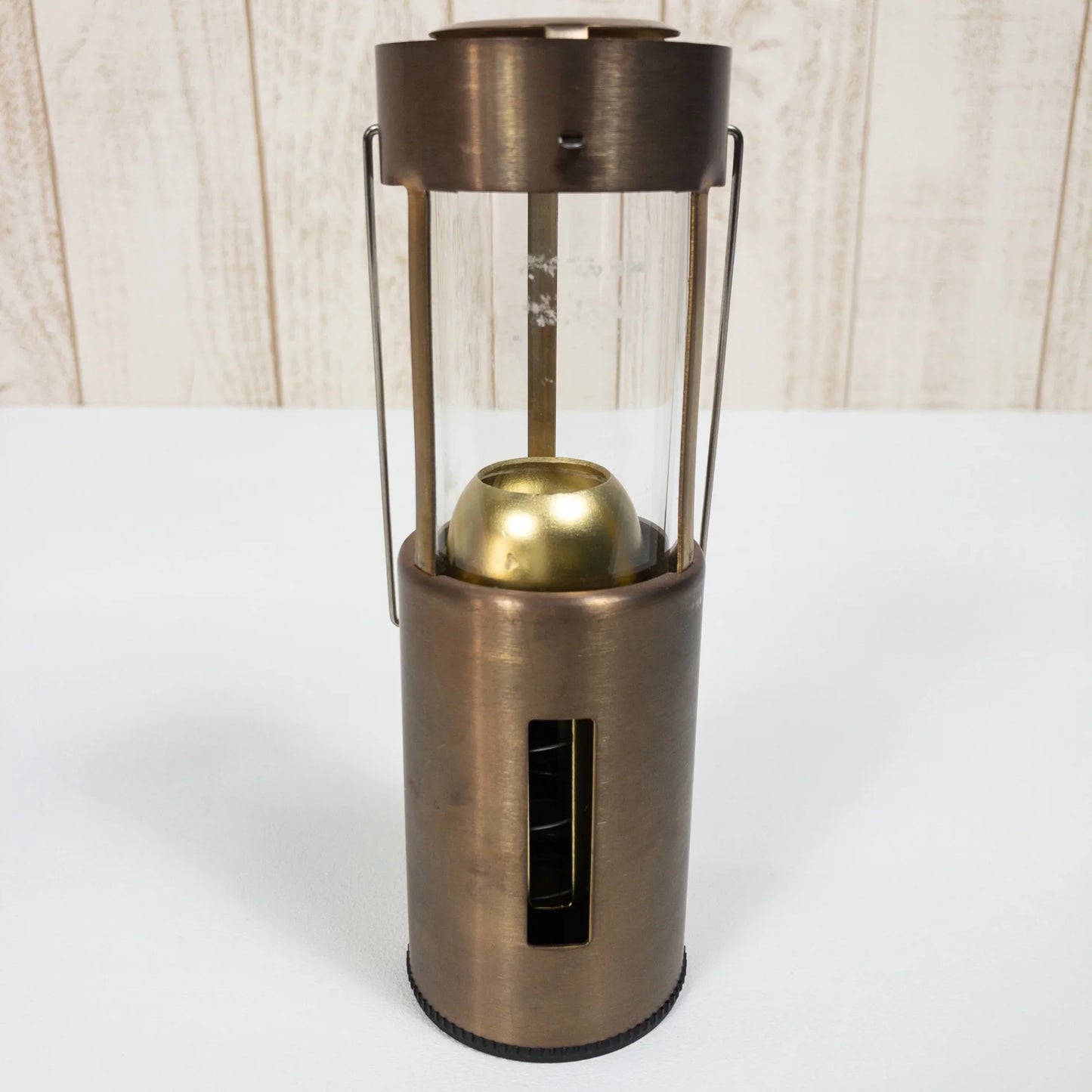 アルミボディで持ち運びに便利な軽量モデルです。かつガラス製のホヤを本体へスライドさせれば小さくなるので気軽に安全に「炎」を持ち歩くことができます。