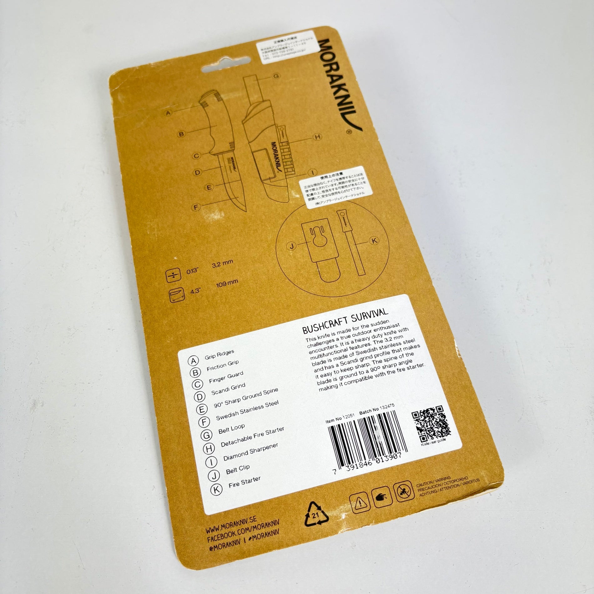 モーラナイフ ブッシュクラフト サバイバル(ステンレス)は、130年以上の歴史を持つスウェーデンのナイフブランド「Morakniv」による、ブッシュクラフトやサバイバル向けの多機能ナイフです。 製品の特徴 強靭なステンレスブレード 刃にはスウェーデンAlleima製の高品質リサイクルステンレス鋼を使用。刃厚は約3.2mmと厚く、バトニング(薪割り)やチョッピング(木への切り込み)などのハードな作業に対応します。また、ブレードの背(スパイン)は角が立っており、付属のファイヤースターターを使って火花を散らすことが可能です。 サバイバルキット一体型シース プラスチック製のシース(鞘)には、「ファイヤースターター」と「ダイヤモンドシャープナー」が統合されたサバイバルキットが付属しています。これにより、火起こしやナイフの簡易的な研ぎ直し(タッチアップ)を現場でスピーディーに行えます。シースにはベルトループとクリップが付属し、携帯性にも優れています。 安定したグリップ ハンドルは人間工学に基づいたポリマー製で、しっかりと握り込めるデザインになっています。内部はタング(金属部分)がハンドルの2/3程度まで入っているタフな構造です。 主な仕様 刃素材: ステンレススチール(Alleima製リサイクル鋼) 柄素材: ラバー 刃長: 約109mm 全長: 約232mm 刃厚: 約3.2mm 重量: 約123g(ナイフのみ) 付属品: プラスチックシース、ファイヤースターター、ダイヤモンドシャープナー、ベルトループ×2 生産国: スウェーデン ※サバイバルキットはシースに固定されており、着脱はできません。ダイヤモンドシャープナーは簡易的なメンテナンス用です。 z00056981