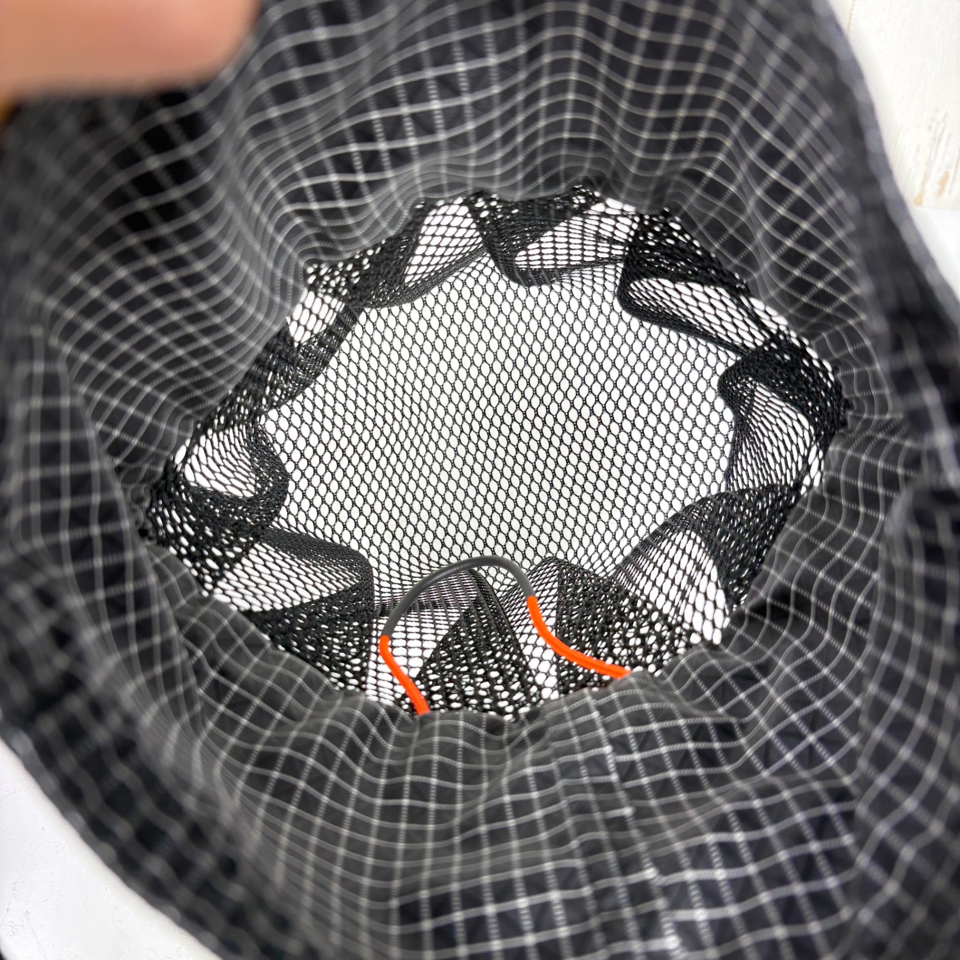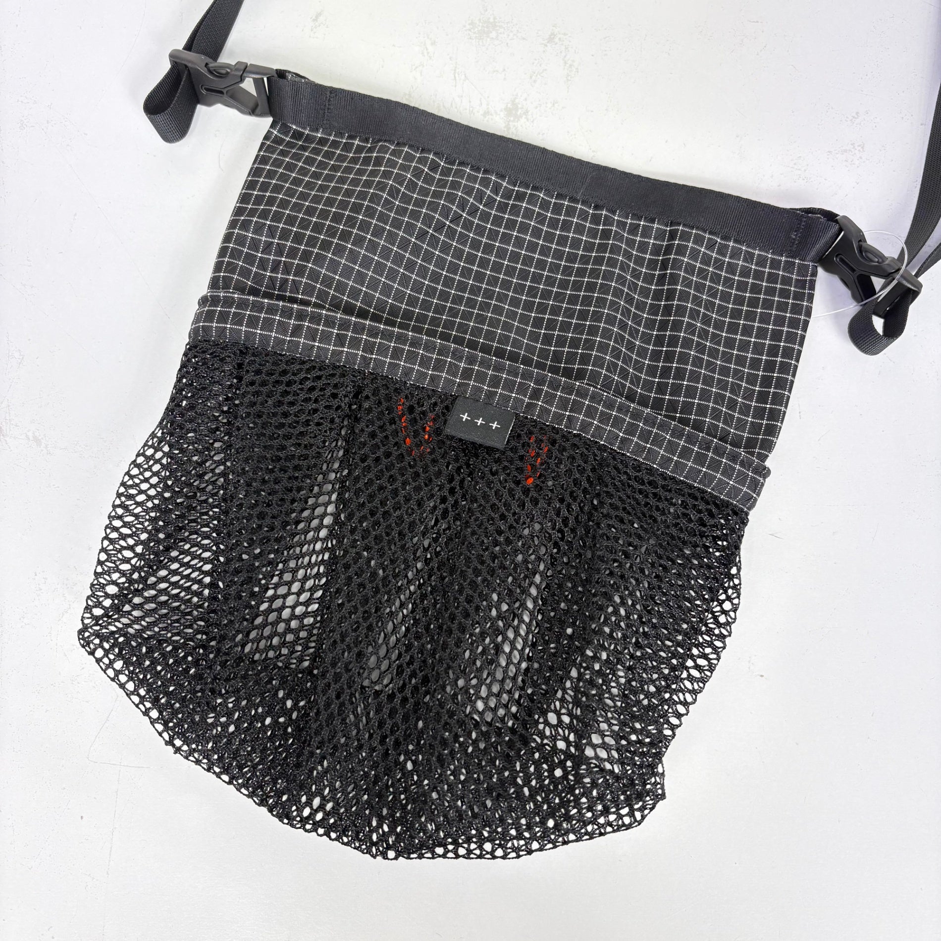 3年間の集大成とも言うべきバッグ。本体はSpectra生地と210デニールのセミダルナイロンラッセルメッシュのコンビで製作。上部はオリジナルスタイルのコードパイピングでソフトボーン仕様の為柔らかく型崩れしないタフ&軽量に仕上げている。下部は軽く上質で丈夫な210デニールのセミダルナイロンを使用したラッセルメッシュ仕様で、床に置いたバッグが型崩れして倒れる心配がない。最大のポイントは底面と側面がシームレス構造な事で、縫い目のないゴム風船みたく内容物によって自在にマチが変化しプリーツ構造でより柔軟性に優れた袋に組み上げた。スマホやタオルはもちろん500mlペットボトルも収めることができる。内部にはコア入り2.4mmコードを一部チューブ仕様にしている為、コード自体がへたらずフック等をかけやすい。ストラップを外せばメッシュ仕様の型崩れしにくいスタッフサックとしても使用可能な2way仕様。重量61g(±2g)。 z00057429