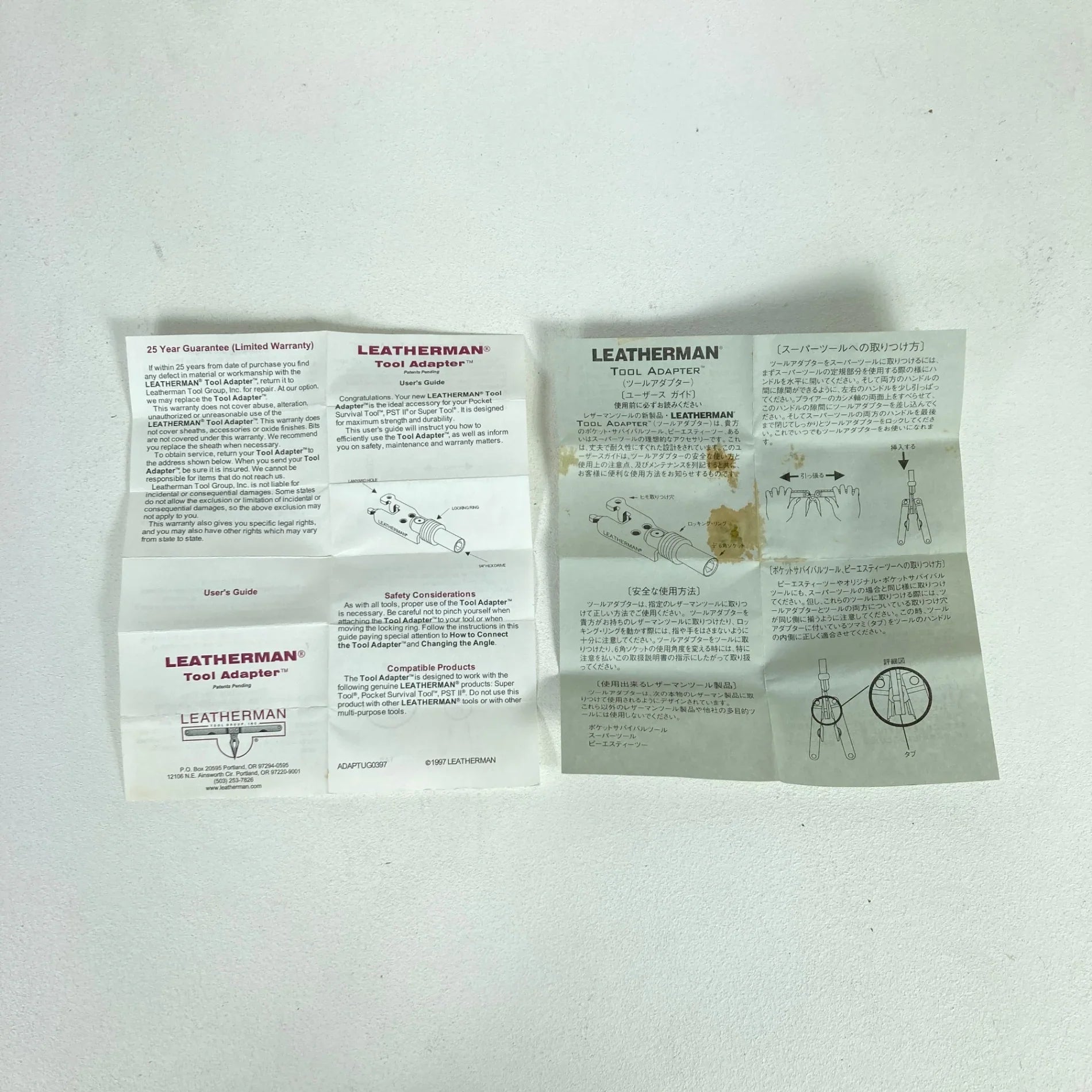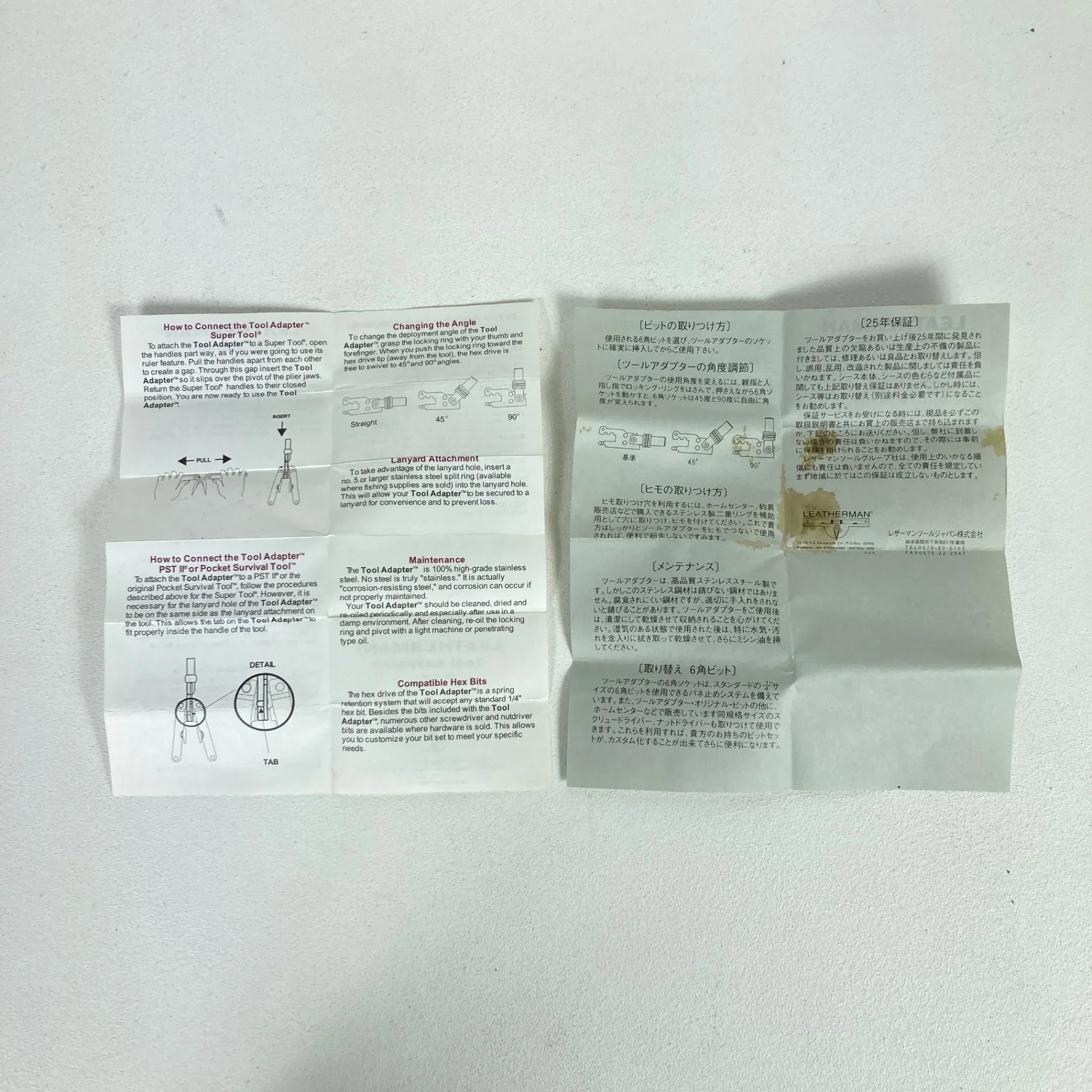 スーパーツール、PST2型レザーマンツールに適応するアダプターです。プラス、マイナスドライバーなど8種類の取り替えビットがついています。(ビットケースは9ヶのビットが収まるようになっています。)レザーマンツールにさらにツールアダプターを加えれば、その機能をさらに向上させてくれます。ツールアダプターは、スーパーツール、ピーエスティーツー、ポケット・サバイバルツール、サイドクリップ、フレアー、パルスに装着できます。各ツールのハンドルを閉じた状態で、そのハンドル部分の間を広げてその間に差し込み、その後両方のハンドルを閉じて使います。ツールアダプターは、一般 的な1/4 インチ6角ドライブに適合した8種類のビットを備えています。いろいろな角度でお使いできるように、標準ポジションの他に、45度、90度と角度を変え、ロックして使えます。 WAVEには専用ツールアダプターが用意されています。 ツールアダプター・スタンダードキットには、3種類(2mm、3mm、4mm角)の6角ドライバー、3種類のプラスドライバー、2種類のマイナスドライバーを標準装備しています。