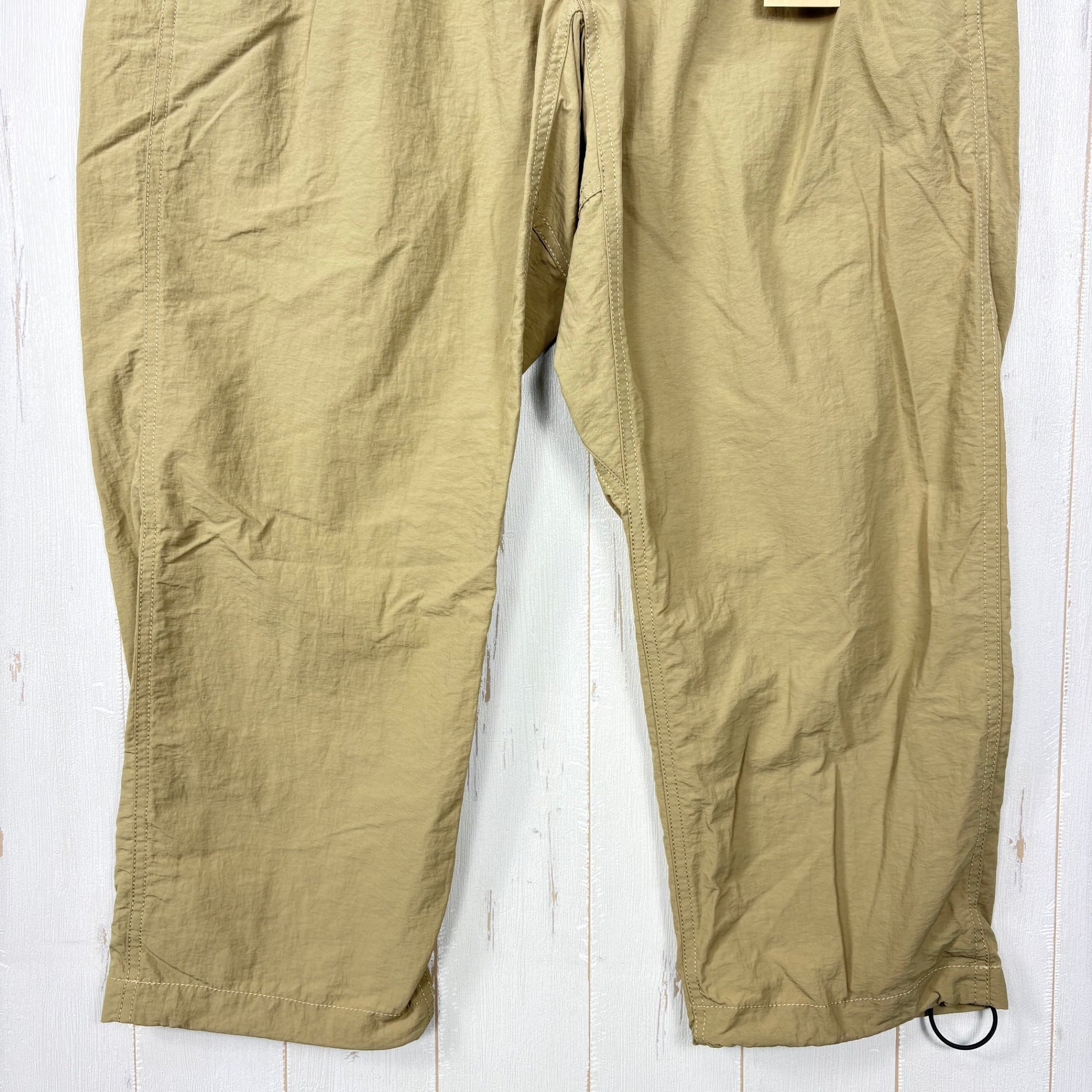 轻便耐用的尼龙面料手感干爽,具有防水性,并具有高速干性。虽然是尼龙面料,但光泽度较低,外观类似棉质。裤脚可通过圆形松紧带和绑带调节,后袋的袋布可收纳。裆部采用插片式设计(裆部可180度开合),可适应各种动作。